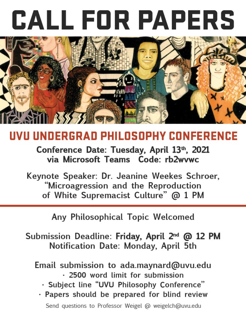 Student philosophy conference at UVU! Abstracts due April 2nd. Share this: Click to share on Facebook (Opens in new window) Facebook More Click to email a link to a friend (Opens in new window) Email Click to share on X (Opens in new window) X Click to share on Tumblr (Opens in new window) Tumblr Like Loading... Related Author: Huenemann Curious about the ways humans use their minds and hearts to distract themselves from the meaninglessness of life. View all posts by Huenemann