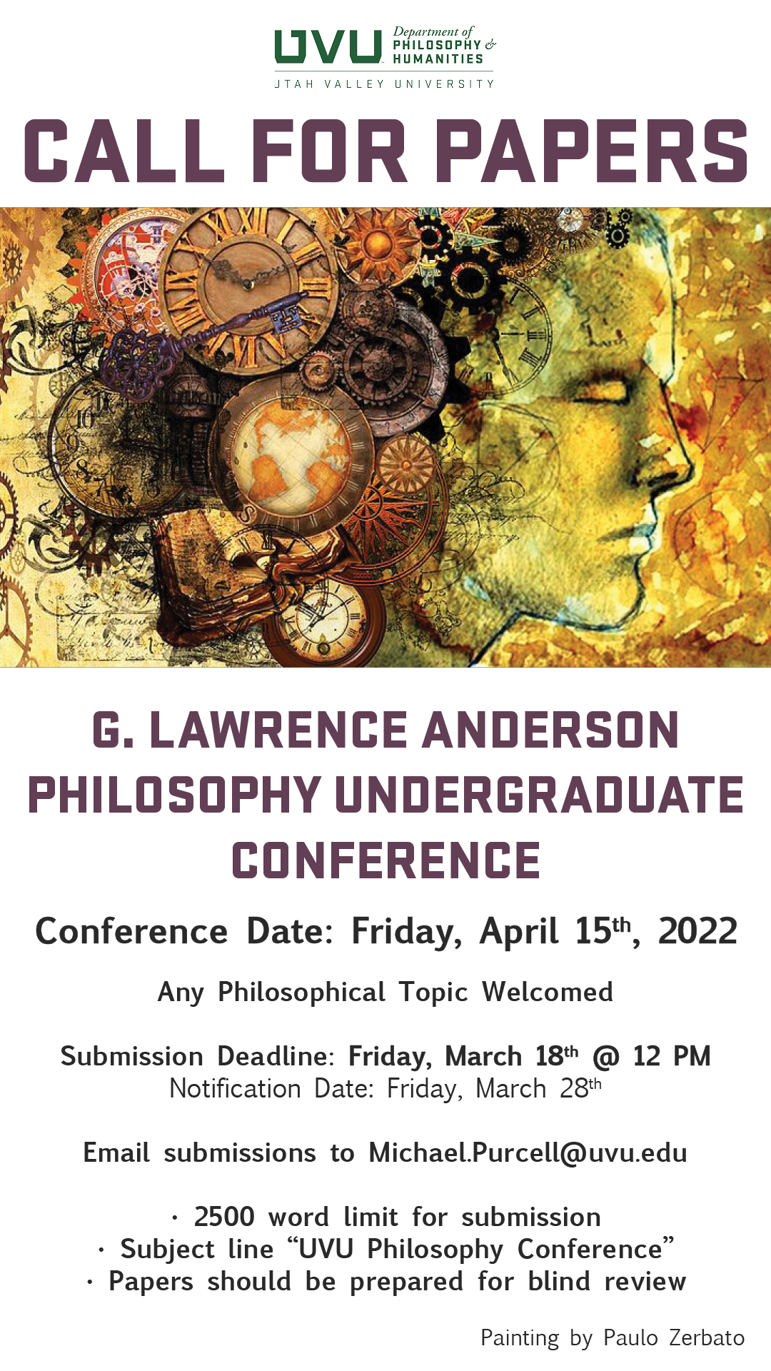 Attached is the CFP for UVU’s (nearly) annual G. Lawrence Anderson Undergraduate Philosophy Conference, scheduled for April 15. Keynote address will be delivered by Dr. Clancy Martin, University of Missouri-Kansas City.