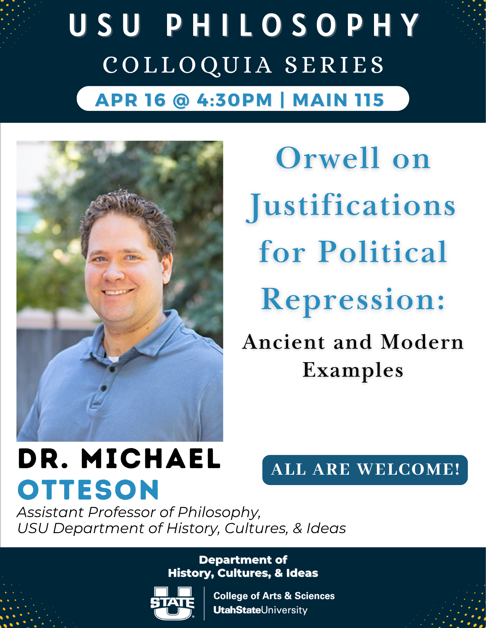 Final Spring 2026 Public Philosophy Colloquium, Thursday, April 17 @ 4:30pm, MAIN 115. All are welcome! Dr. Michael Otteson will present “Orwell on Political Justifications for Political Repression: Ancient and Modern Examples” Share this: Share on Facebook (Opens in new window) Facebook More Email a link to a friend (Opens in new window) Email Share on X (Opens in new window) X Share on Tumblr (Opens in new window) Tumblr Like Loading... Related