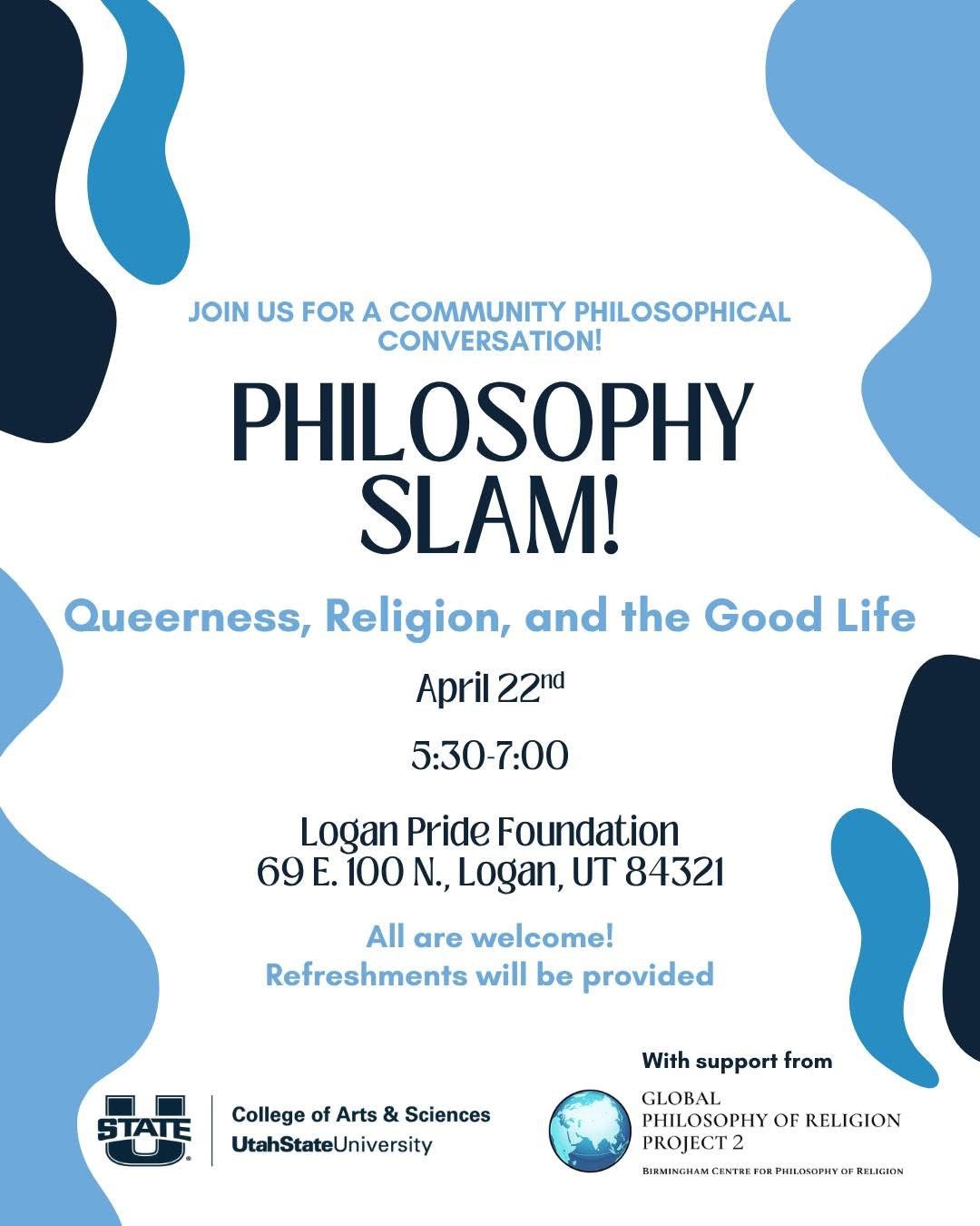 Public Philosophy Slam! “Queerness, Religion, and the Good Life,” Wednesday, April 22, 5:30pm @ Logan Pride All are welcome! Refreshments provided! Hope to see you there! Share this: Share on Facebook (Opens in new window) Facebook More Email a link to a friend (Opens in new window) Email Share on X (Opens in new window) X Share on Tumblr (Opens in new window) Tumblr Like Loading... Related