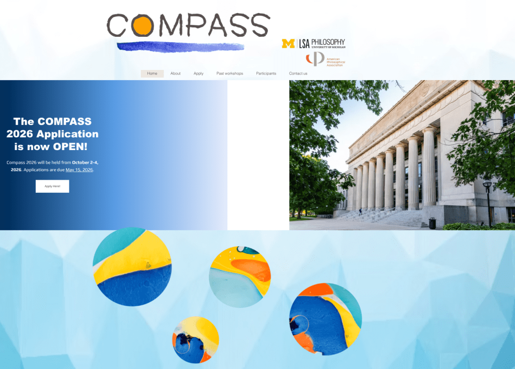 The Department of Philosophy at the University of Michigan is thrilled to announce COMPASS at Michigan 2026. The workshop will bring together students with an interest in pursuing academic philosophy for a weekend of discussion, networking, and mentoring. Advanced undergraduates and M.A. students (first and second year) who are planning to apply to graduate institutions in North America are eligible to apply. All costs (travel, food, lodging) will be paid for by the program.
