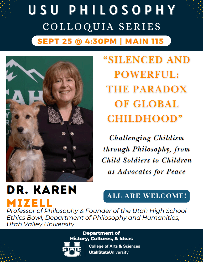 Colloquium Next Thursday, Sept 25 with Dr. Karen Mizell (UVU, Philosophy)