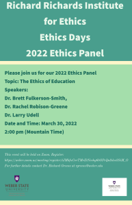 We have two events taking place in partnership with Weber State this week. One is an Ethics Panel discussion on Philosophy and Education. That will take place Wednesday, March 30th at 2:00 p.m. That event will occur on Zoom. To register, click on this link: https://weber.zoom.us/meeting/register/tJMkfuCvrTMrEtNeehy6bOPcQa2dse2SiM_O