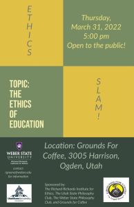 The other is an Ethics Slam, also on the topic of Ethics and Education. That will be held on Thursday, March 31st at Grounds for Coffee on 25th Street in Ogden (3005 Harrison Blvd) at 5:00 pm (it will last roughly an hour. Hope to see some of you there!