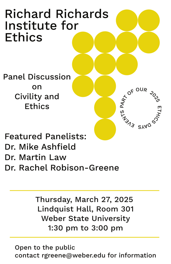Richard Richards Institute for Ethics @ Weber State hosts USU Comm Studies & Phil Profs for Panel on “Civility and Ethics,” 3/27 @ 1:30pm